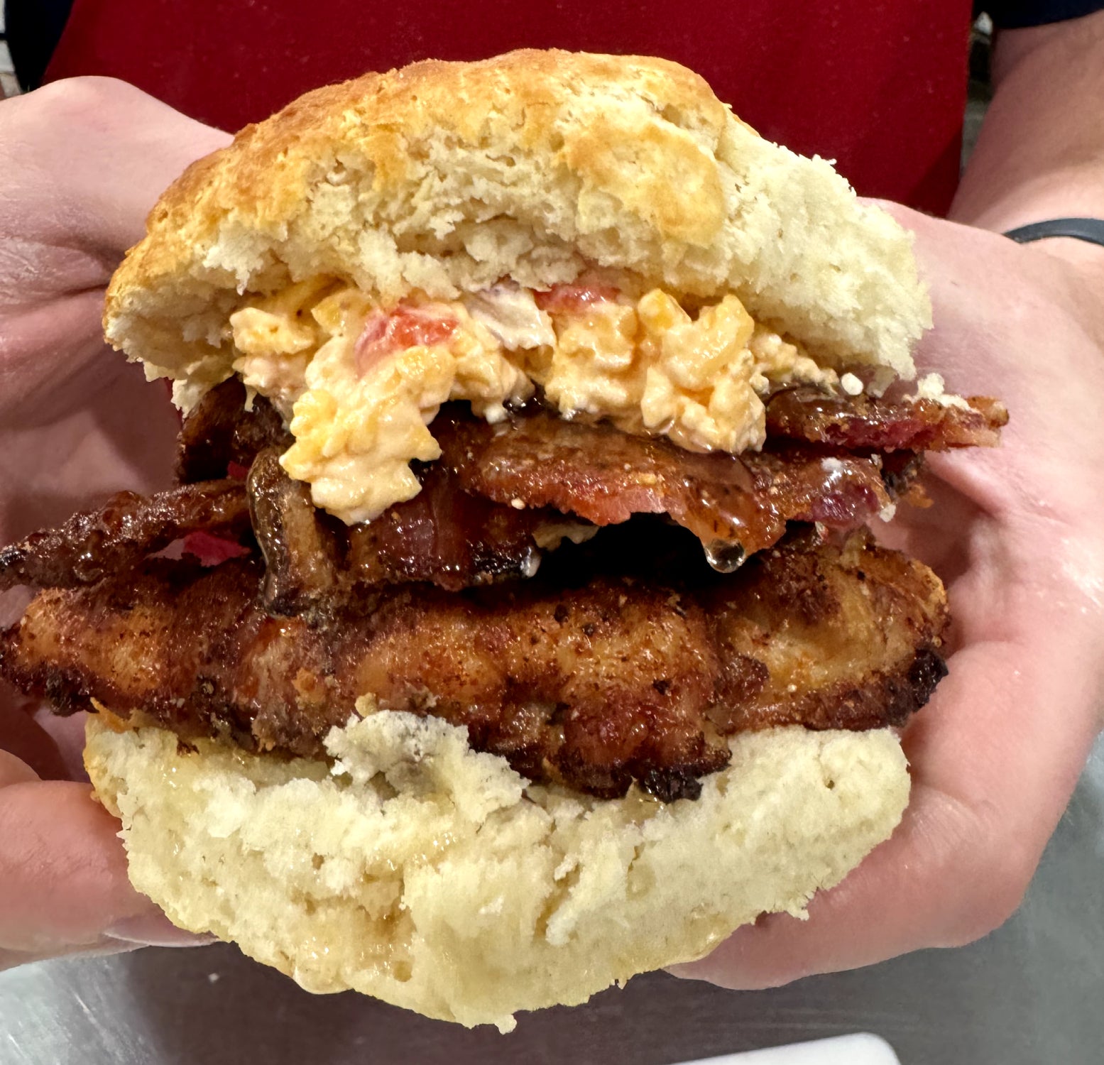 Smoked chicken thigh w/ candied bacon, pimento cheese, and local honey on a Lane's famous biscuit!